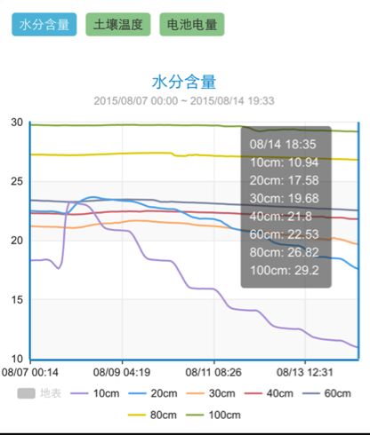 项目方安装智墒之后,通过智墒实时监测土壤不同层次水分含量的变化,安排作物的灌溉浇水。例如2015年8月7日到14日,土壤表层观察非常干燥,以前直接安排浇水,智墒监测也显示10厘米土层的水分含量下降很快,证实了表面的观察。但通过智墒显示,20厘米及以下的土层水分含量下降并不快,玉米的根系可以达到那个深度,目前的水分含量可以满足玉米的生长需求,所以无需安排浇水。